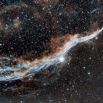 La nebulosa Velo  visibile in estate (giugno-ottobre) è una vasta  nebulosa diffusa, posta a circa 1.470 a.l.  nella foto ho ripreso una parte della nebulosa la  sezione occidentale  (la scopa della strega) catalogata NGC 6960. La nebulosa si trova nella parte sud orientale della costellazione del cigno. L’oggetto appare formato da delicati filamenti nebulosi, ossigeno tonalità blu-verde, e idrogeno ionizzato colore rosso.