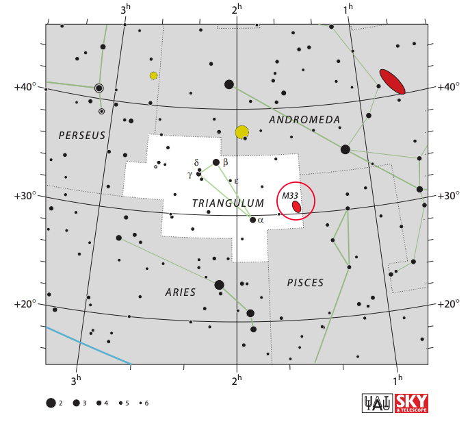 M33  conosciuta anche come Galassia del triangolo è una galassia a spirale situata nella costellazione del triangolo, distante  2,9 a.l ha una dimensione che varia da 50.000 a 60.000 a.l. dopo “Andromeda” è la seconda galassia non nana più vicina alla terra.